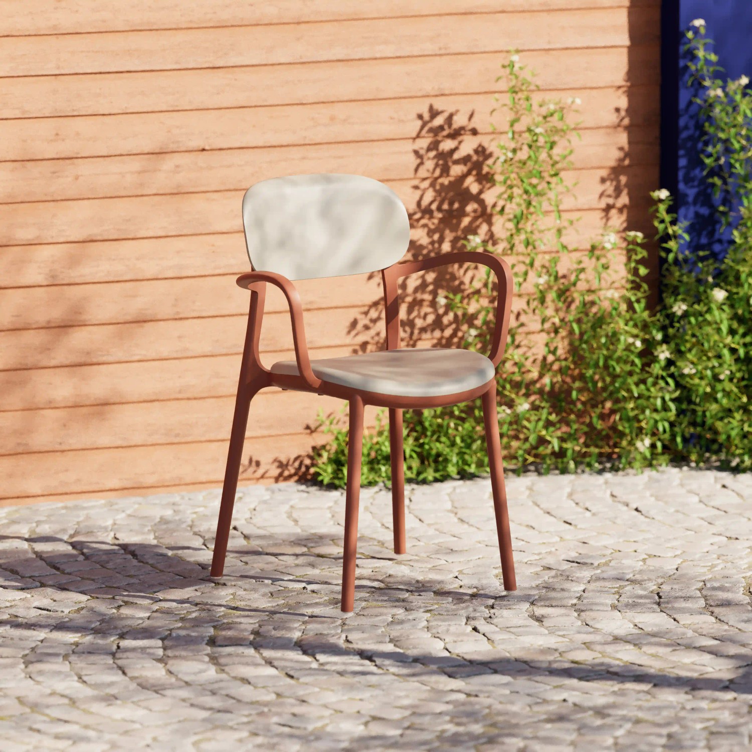 الهيكل البلاستيكي ذو أرجل أحادية، الظهر والمقعد يتكون من عدة مكونات, بولي بروبيلين معالج بالأشعة فوق البنفسجية، أصباغ وألياف زجاجية، أطراف الأرجل: PVC طبيعي غير قابل للانزلاق، (تطبيق تثبيت محكم) عناصر الربط: معدن مقاوم للصدأ