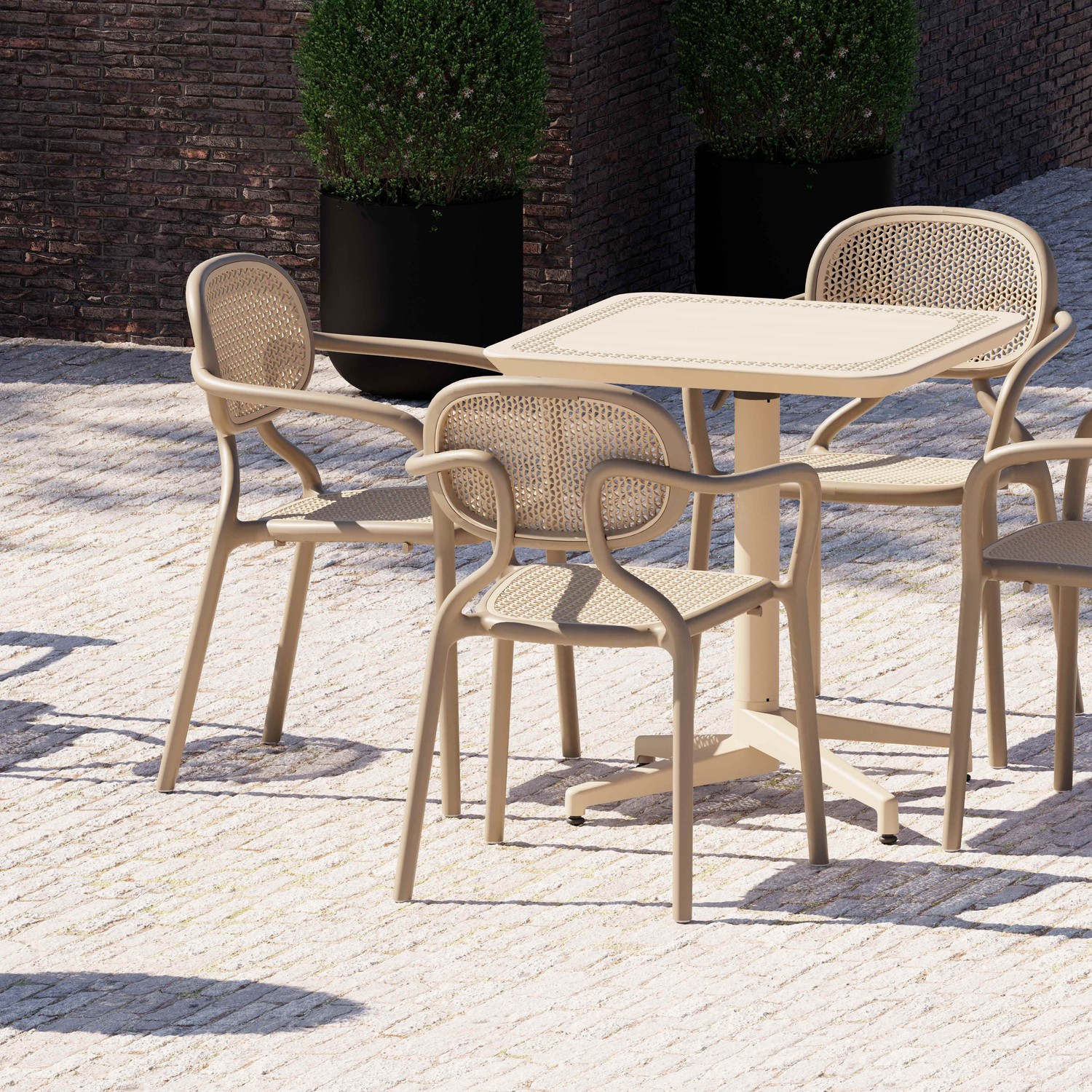 طاولة تتكون من عدة مكونات مثل اللوح البلاستيكي، الصليب، الأرجل وأنبوب الأرجل الألومنيوم. المواد: بولي بروبيلين/بولي أميد/بولي فتلاميد مع ألياف زجاجية، سدادة أرجل قابلة للتعديل، أنبوب ألومنيوم وعناصر توصيل معدنية مقاومة للصدأ. الأسطح البلاستيكية غير لامعة ومقاومة عالية للتآكل. الأسطح المعدنية معالجة بشكل خاص ولامعة، طلاء مسحوقي خالٍ من المذيبات. أرجل غير قابلة للانزلاق.