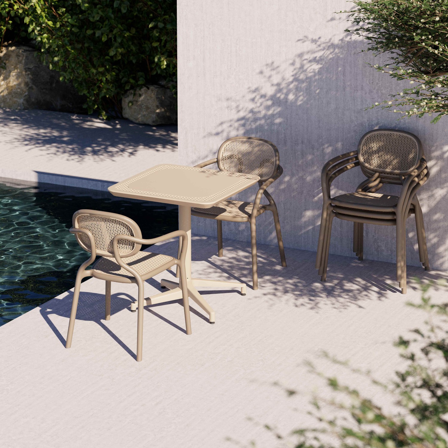 طاولة تتكون من عدة مكونات مثل اللوح البلاستيكي، الصليب، الأرجل وأنبوب الأرجل الألومنيوم. المواد: بولي بروبيلين/بولي أميد/بولي فثالاميد مع ألياف زجاجية وصبغة وUV، سدادة أرجل قابلة للتعديل، أنبوب ألومنيوم وعناصر ربط معدنية مقاومة للصدأ. الأسطح البلاستيكية غير لامعة ومقاومة عالية للتآكل. الأسطح المعدنية معالجة بشكل خاص ولامعة، طلاء مسحوق خالي من المذيبات. أرجل غير قابلة للانزلاق.