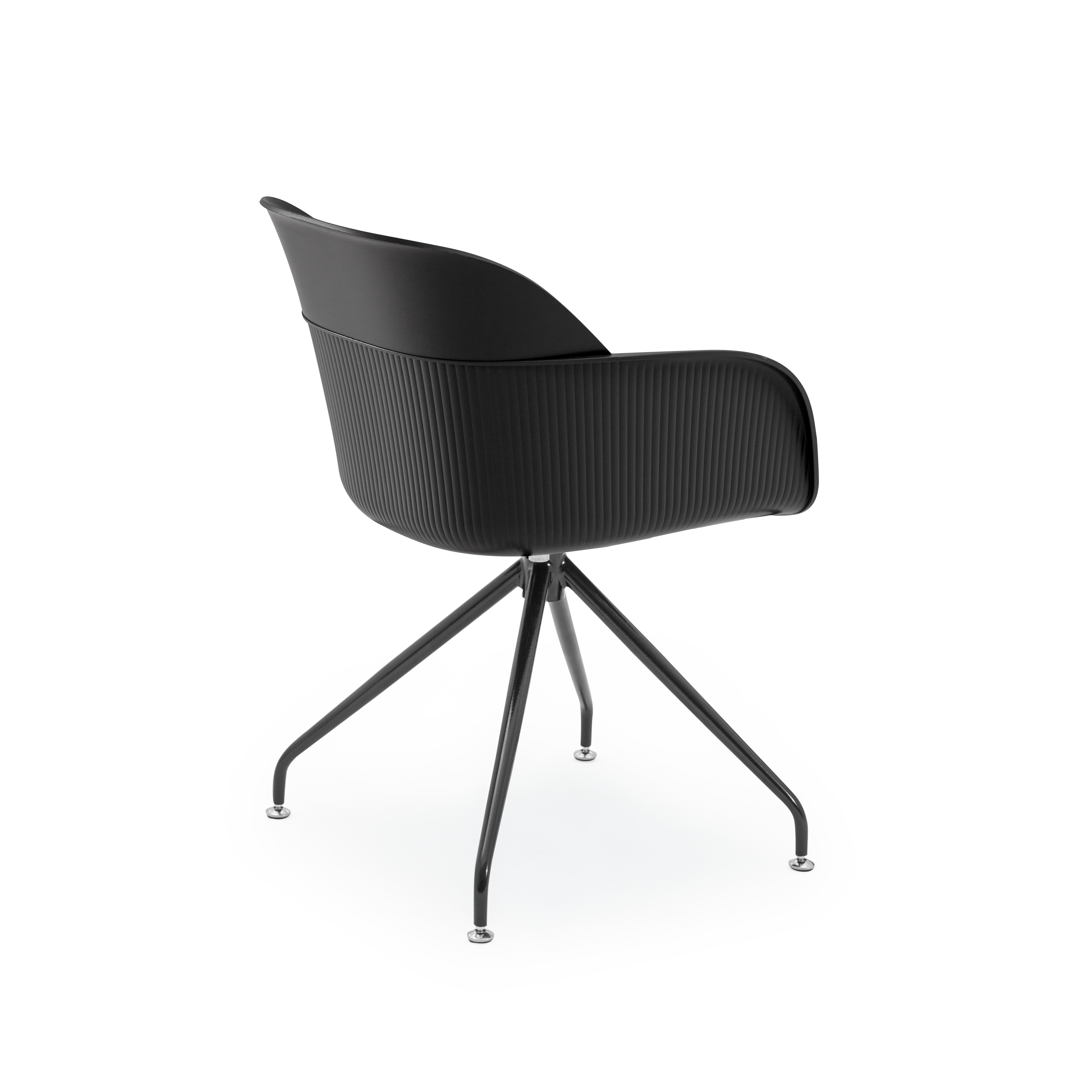 Armchair composed of multiple components, including a metal base, an interconnecting piece that allows for 360-degree rotation on its axis, and a plastic seat. The seat surface is matte and textured with high wear resistance. The surfaces of the metal base and interconnecting piece are specially treated to be shiny. Materials: Body: UV, pigment, and glass fiber-reinforced polypropylene, Foot Cap: Hinged pingo that fully contacts the surface (Screw application), Legs and Interconnecting Piece: Metal with solvent-free powder coating, Fasteners: Stainless metal