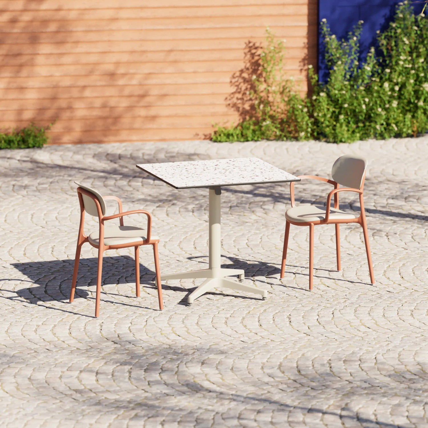 A table composed of multiple components such as HPL/CPL compact tabletop, plastic folding mechanism, crossbar, legs, and aluminum leg tube. Materials: HPL/CPL tabletop, UV, Pigment, and Glass Fiber Reinforced Polypropylene/Polyamide/Polypthalamide, adjustable foot cap, aluminum tube, and stainless metal connectors. Plastic surfaces are matte and textured with high abrasion resistance. Metal surfaces are specially treated with a glossy, solvent-free powder coating. Non-slip feet.