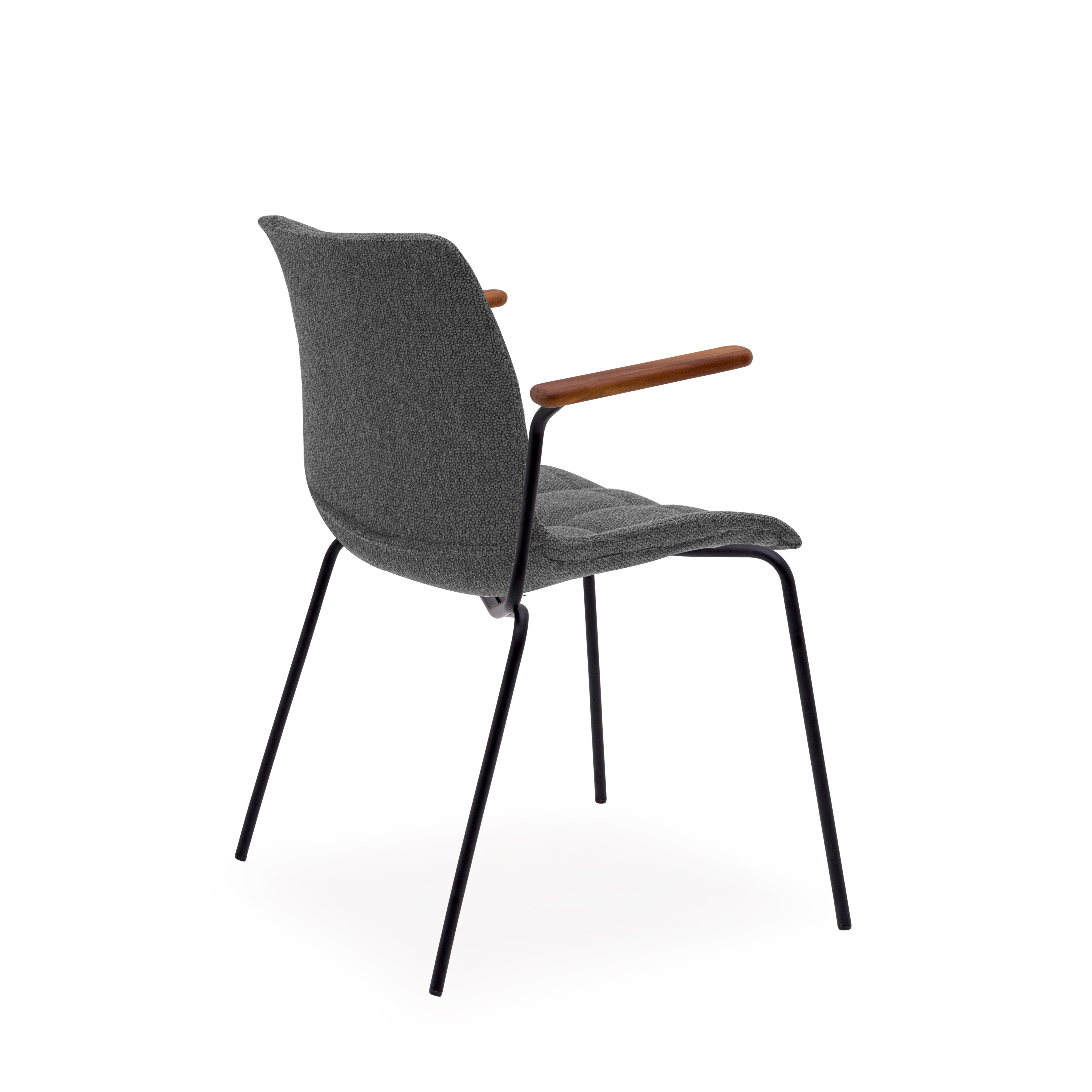 Μονόμπλοκ μεταλλικό μπράτσο και πόδι, με μπράτσα από ξύλο τικ και κάθισμα από πλαστικό καλυμμένο με ύφασμα, αποτελούν μια πολυσύνθετη καρέκλα με μπράτσα. Η επιφάνεια του καθίσματος είναι καλυμμένη με ύφασμα. Η μεταλλική επιφάνεια έχει υποστεί ειδική επεξεργασία και είναι γυαλιστερή. Υλικά: Σώμα: Πολυπροπυλένιο με UV, χρωστική και υαλοΐνες, επάνω ύφασμα και σφουγγάρι Τάπα ποδιού: Πολυπροπυλένιο με χρωστική και υαλοΐνες, (εφαρμογή σφιχτής τοποθέτησης