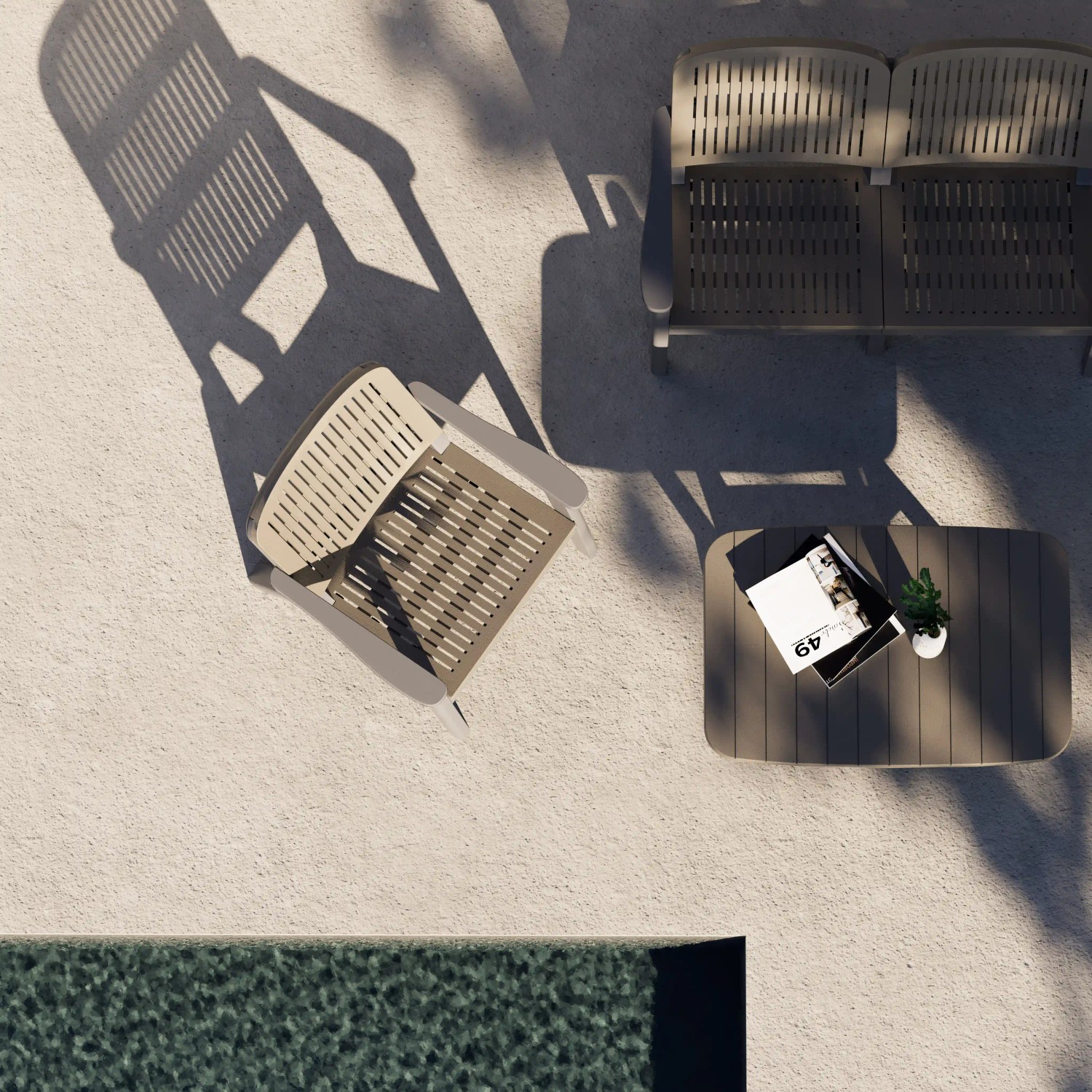 Set di Sedute composto da più componenti come supporti in plastica, sedute, cuscini, schienali e collegamenti delle gambe con o senza braccioli, che può essere assemblato singolarmente, in coppia o in trio su richiesta. Materiali: Polipropilene con UV, Pigmento e Fibra di vetro, tessuto per rivestimenti e spugna. Tappi per gambe e elementi di collegamento in plastica. Cuscino rivestito in tessuto.