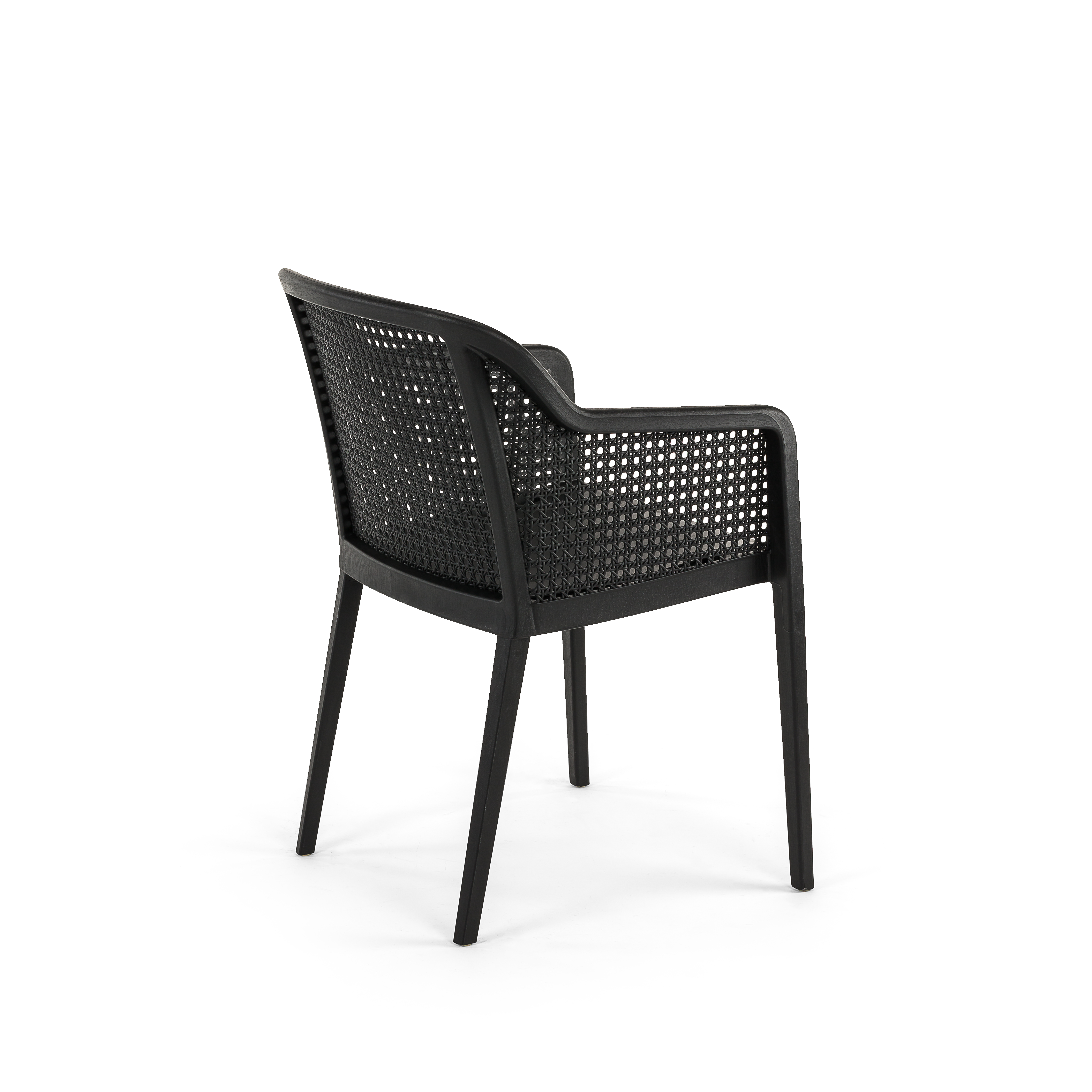 Sedia impilabile in plastica monoblocco con braccioli. Tutte le superfici sono opache e ruvide con alta resistenza all'usura. Materiali: Struttura: polipropilene con UV, pigmento e fibra di vetro, Tappo del piede: antiscivolo in PVC naturale, (applicazione a incastro stretto)