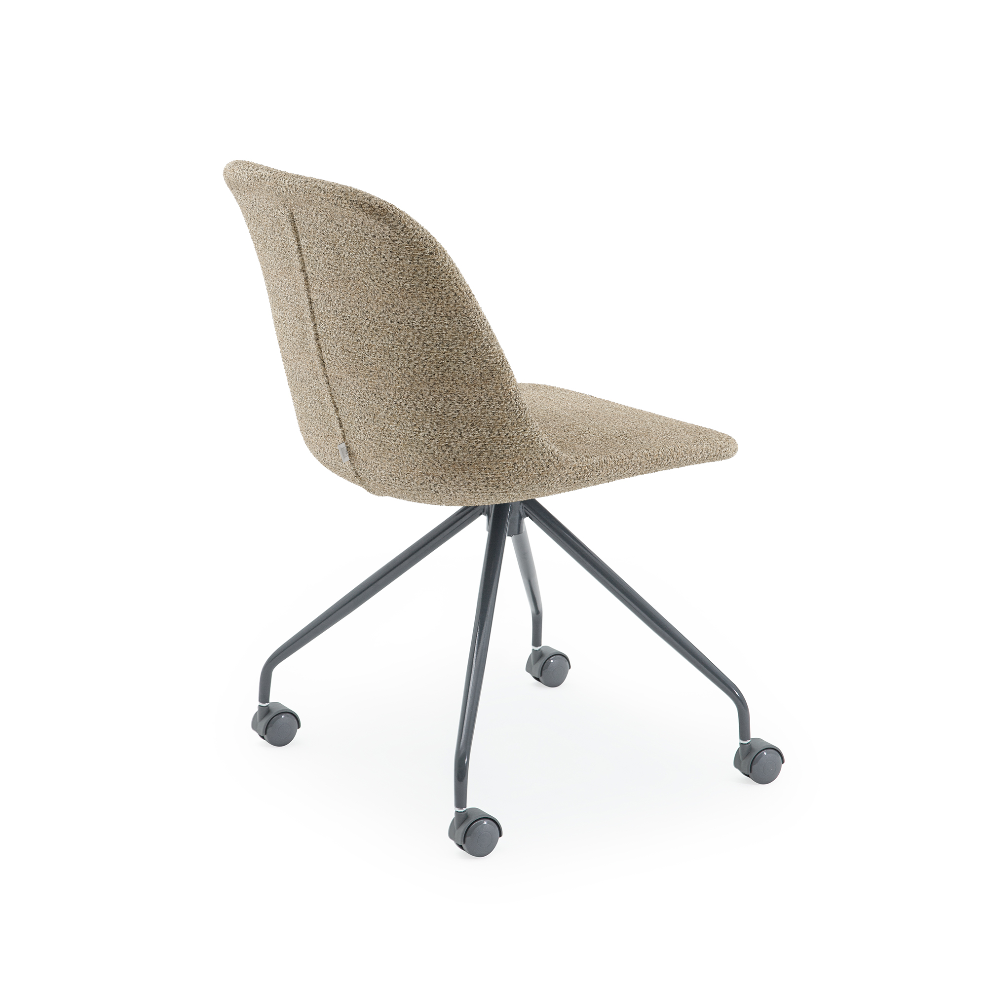 A multi-component armless chair consisting of a metal base with plastic wheels and an interconnecting piece that allows it to rotate 360 degrees around its axis, with a fabric-covered plastic seat. The seat surface is matte and textured with high abrasion resistance. The surface of the metal base and interconnecting piece is specially treated to be shiny. Materials: Body: Upholstery foam and fabric with UV, pigment, and glass fiber-reinforced polypropylene, Base Wheels: Plastic wheels that rotate fully on their axis (Press-fit application), Base and Interconnecting Piece: Metal with solvent-free powder coating, Fasteners: Stainless metal.