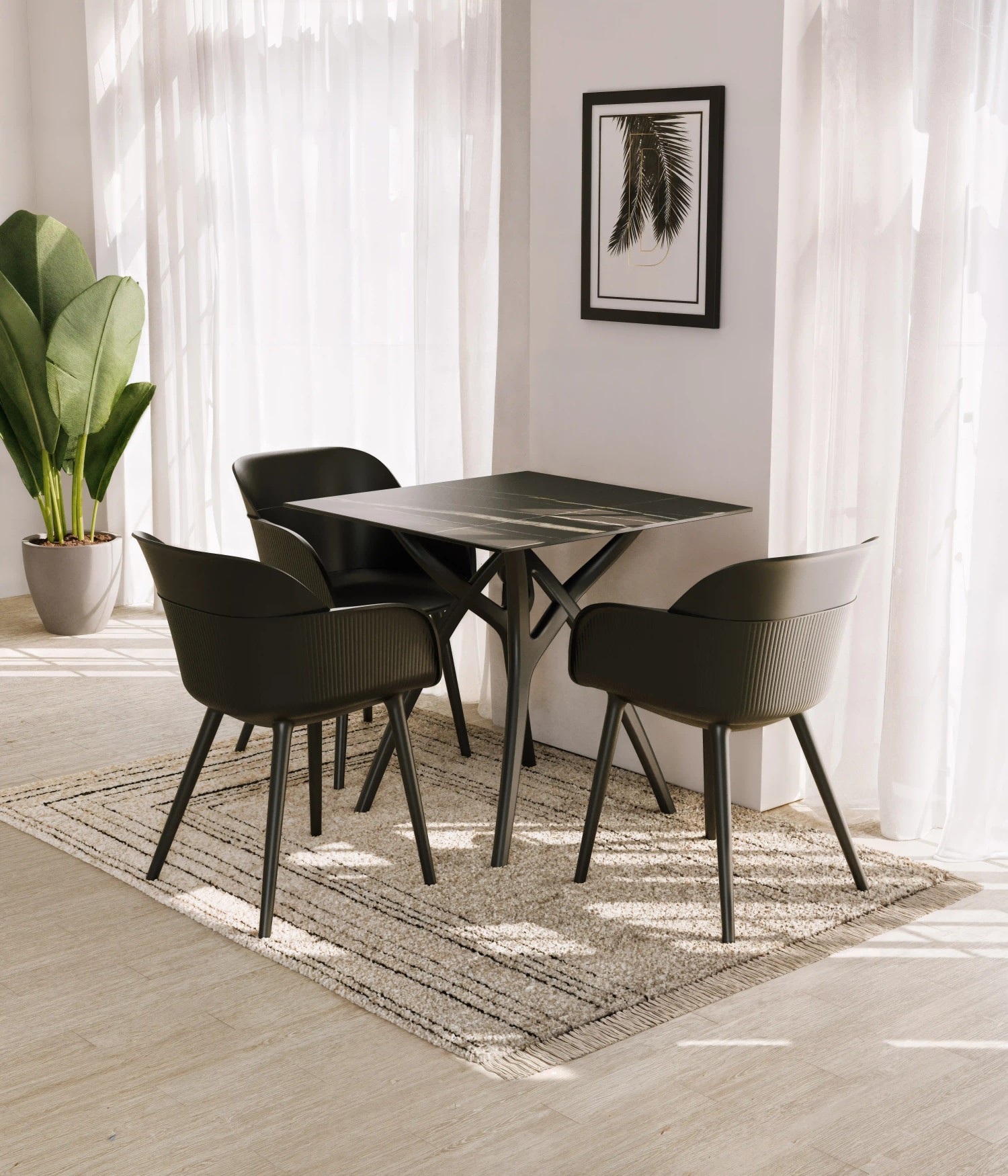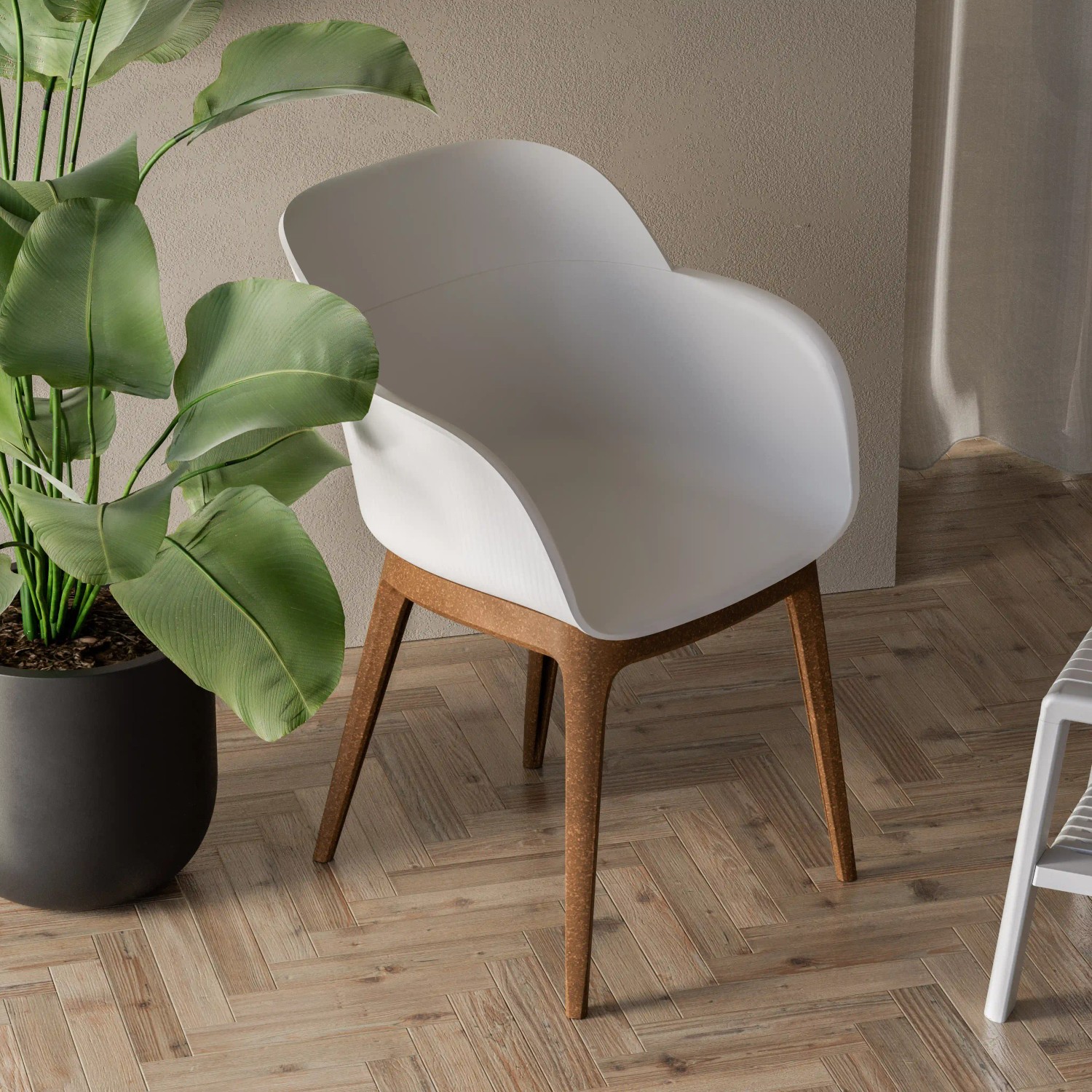 Sedia senza braccioli composta da due componenti: seduta e gambe in plastica monoblocco. La superficie della seduta è opaca, ruvida e altamente resistente all'usura. La superficie delle gambe monoblocco è opaca, liscia e altamente resistente all'usura. Materiali: Corpo: polipropilene con protezione UV, pigmenti e fibra di vetro, Gambe monoblocco: plastica ingegnerizzata in polipropilene con protezione UV, pigmenti, fibra di vetro e gusci di riso, Tappo per gambe: PVC naturale antiscivolo, (applicazione a incastro), Elementi di collegamento: metallo inossidabile