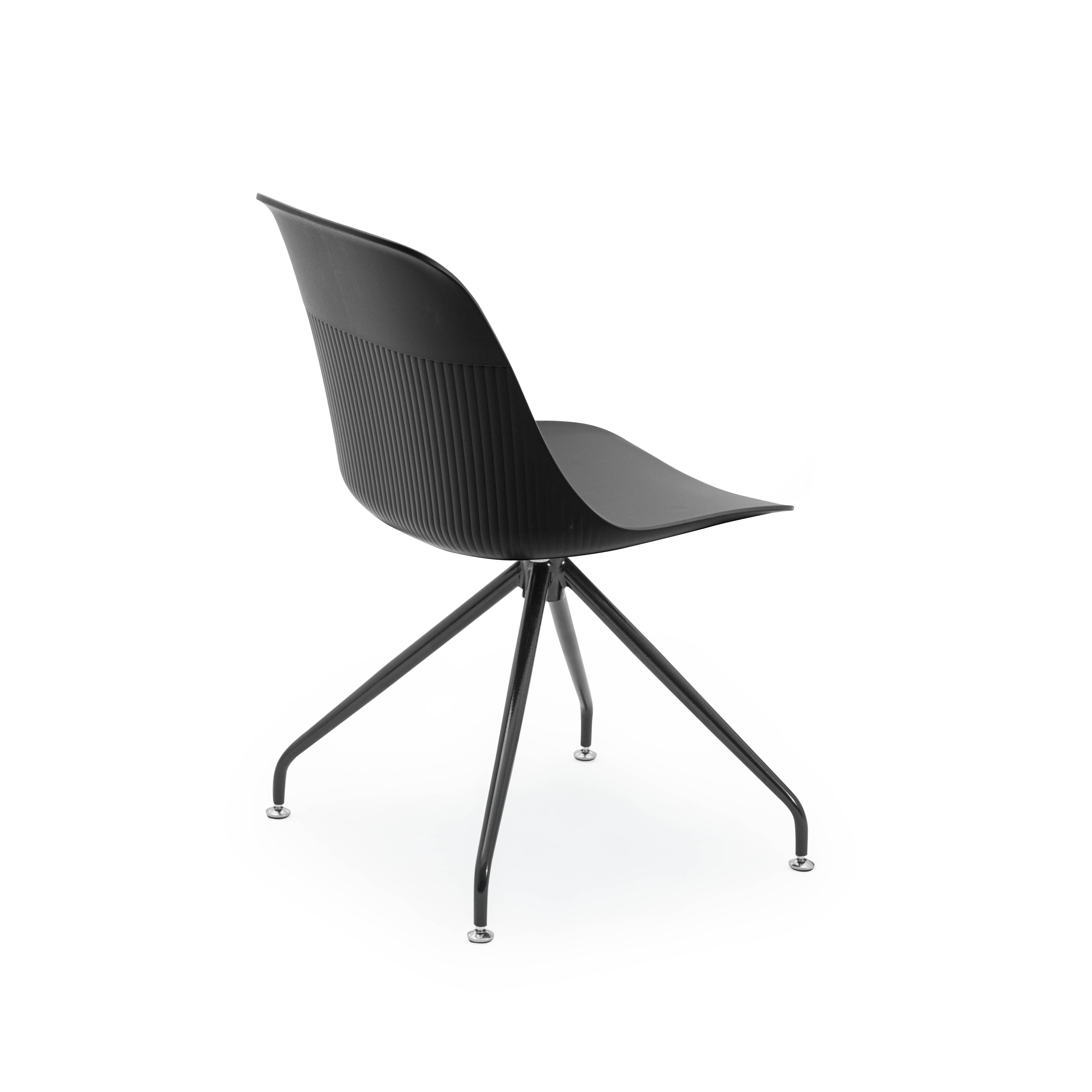 A chair without armrests, composed of multiple components such as a metal base and an intermediary connection piece that allows for 360-degree rotation, with a plastic seat. The seat surface is matte and textured with high wear resistance. The surfaces of the metal base and the intermediary connection piece have undergone a special treatment to achieve a glossy finish. Materials: Body: UV, pigment, and glass fiber-reinforced polypropylene Base Plug: Hinged pingo that fully contacts the surface (screw application) Base and Intermediary Connection Piece: Metal with solvent-free powder coating Fasteners: Stainless metal