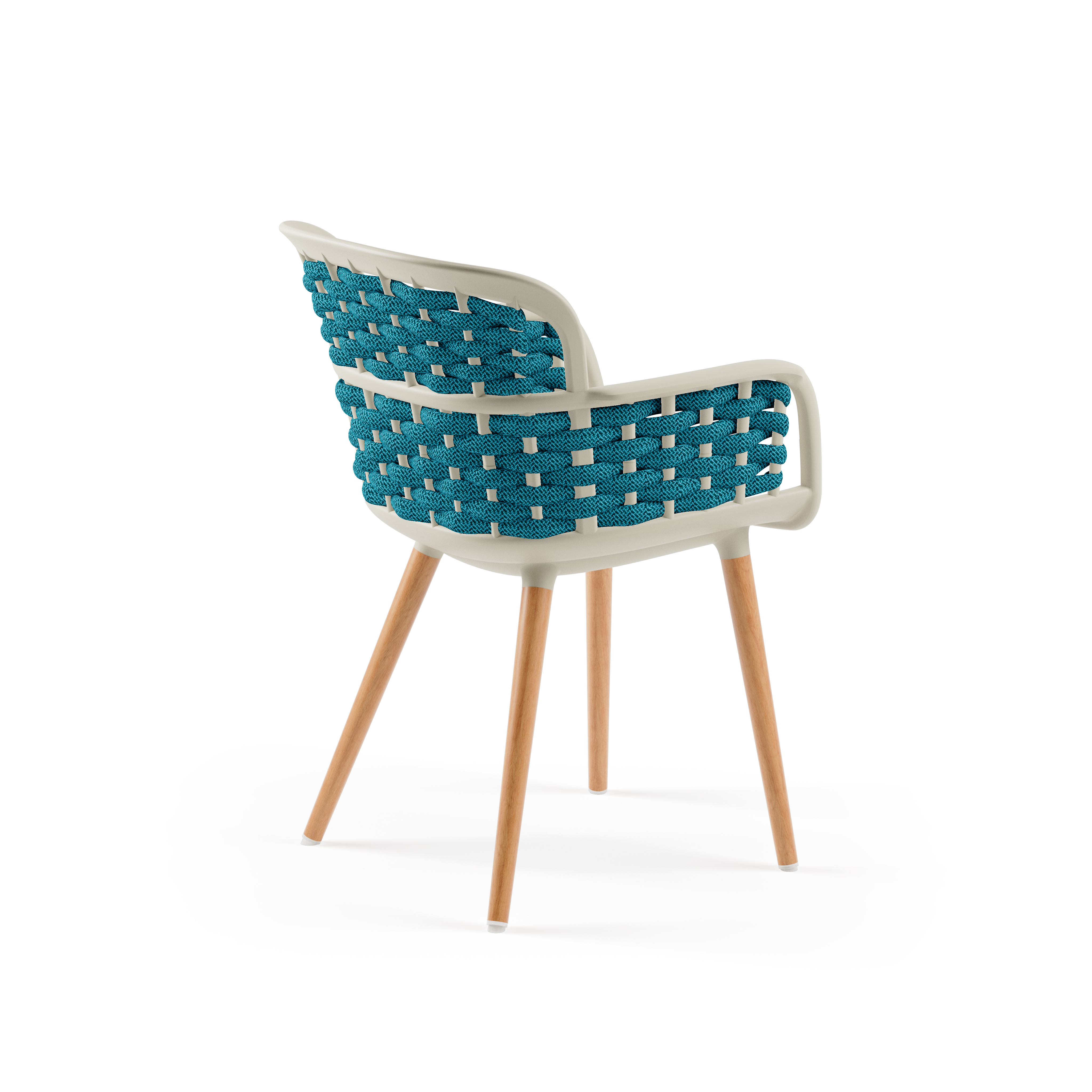 Ahşap ayaklar, plastik ara bağlantı parçası, oturak ve sırt ip örgüsü olarak çok kompenentten oluşan kolçaklı sandalye. Oturak ve ara bağlantı yüzeyi yüksek aşınma dayanımlı mat ve pütürlü. Sırt ve yan alanlar yüksek dauyanımlı ip örgülü. Ahşap ayak yüzeyi koruyucu özel işlem görmüş parlak. Malzemeler : Gövde : UV, pigment ve cam elyaflı polipropilen üstü dekoratif naylon ip örgülü. Ara bağlantı parçası : UV, pigment ve cam elyaflı polyamit, Ayak Tıpası : Natural PVC'den temas yüzeyini arttıran açıda ve kaydırmaz, (Çivili uygulama), Ayaklar : Naturel kayın ağacı ve koruyucu vernik, Bağlantı Elemanları : Paslanmaz metal