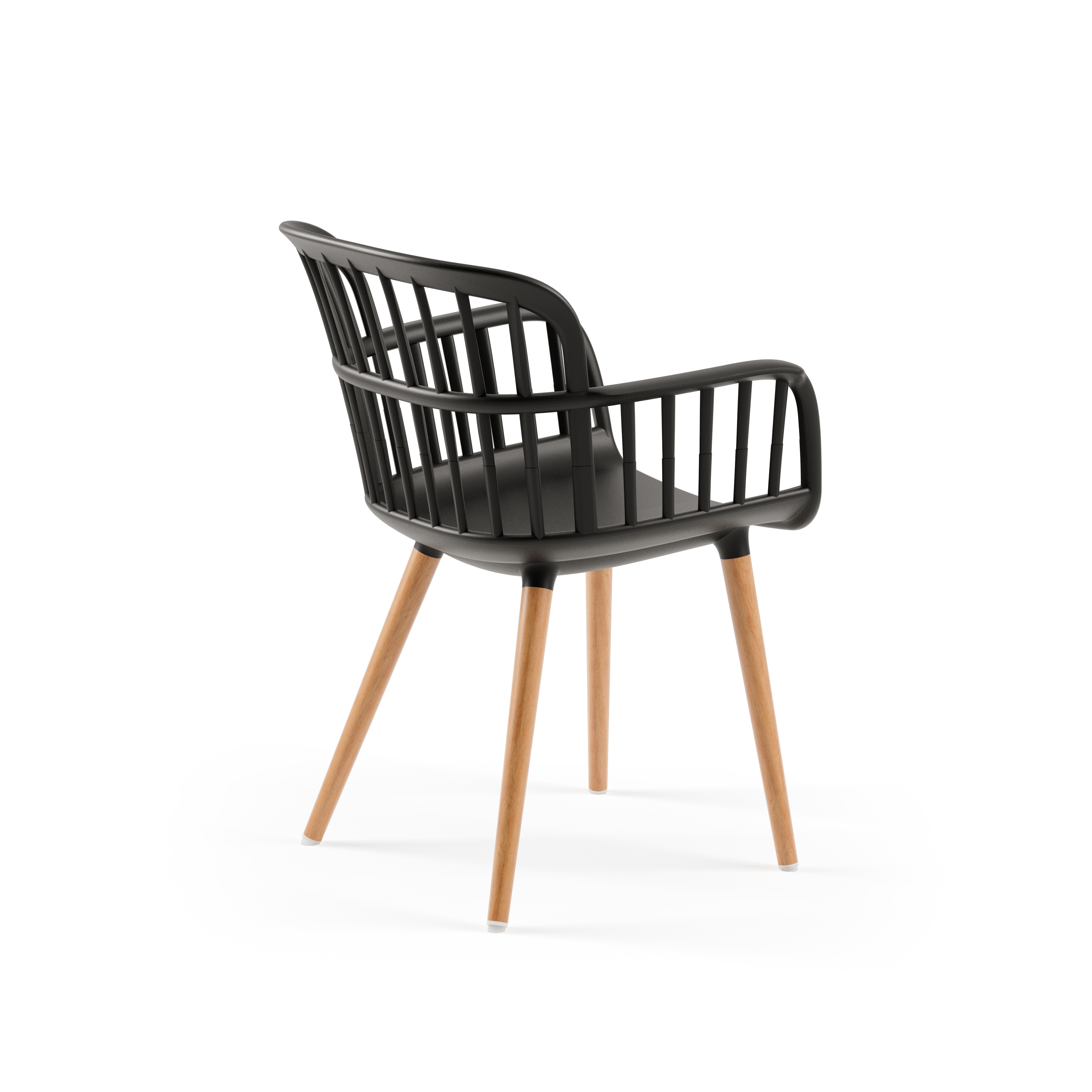 Ahşap ayaklar, ara bağlantı parçası ve plastik oturak olarak çok kompenentten oluşan kolçaklı sandalye. Oturak ve ara bağlantı yüzeyi yüksek aşınma dayanımlı mat ve pütürlü. Ahşap ayak yüzeyi koruyucu özel işlem görmüş parlak. Malzemeler : Gövde : UV, pigment ve cam elyaflı polipropilen Ara bağlantı parçası : UV, pigment ve cam elyaflı polyamit, Ayak Tıpası : Natural PVC'den temas yüzeyini arttıran açıda ve kaydırmaz, (Çivili uygulama), Ayaklar : Naturel kayın ağacı ve koruyucu vernik, Bağlantı Elemanları : Paslanmaz metal