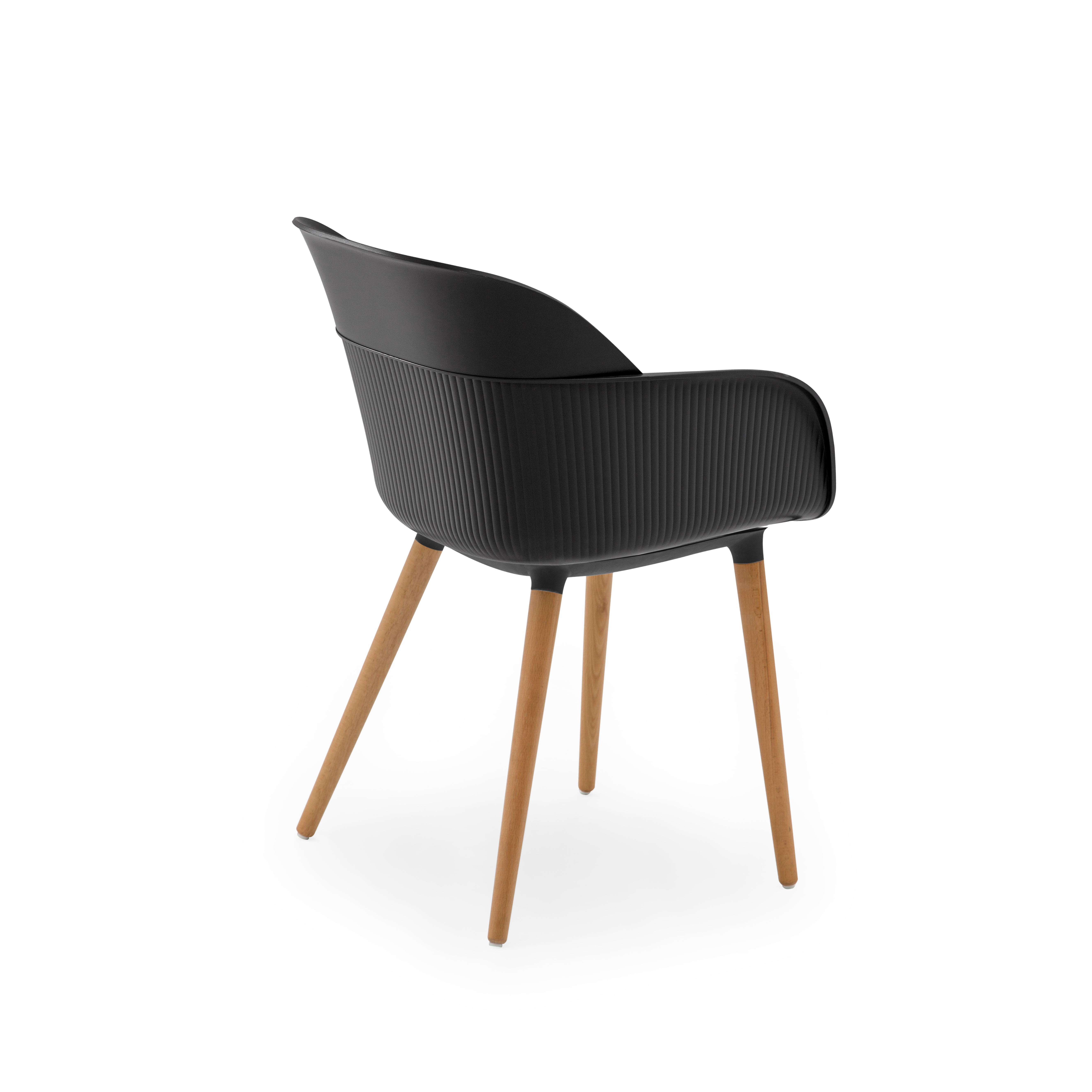 Ahşap ayaklar, ara bağlantı parçası ve plastik oturak olarak çok kompenentten oluşan kolçaklı sandalye. Oturak ve ara bağlantı yüzeyi yüksek aşınma dayanımlı mat ve pütürlü. Ahşap ayak yüzeyi koruyucu özel işlem görmüş parlak. Malzemeler : Gövde : UV, pigment ve cam elyaflı polipropilen Ara bağlantı parçası : UV, pigment ve cam elyaflı polyamit, Ayak Tıpası : Natural PVC'den temas yüzeyini arttıran açıda ve kaydırmaz, (Çivili uygulama), Ayaklar : Naturel kayın ağacı ve koruyucu vernik, Bağlantı Elemanları : Paslanmaz metal